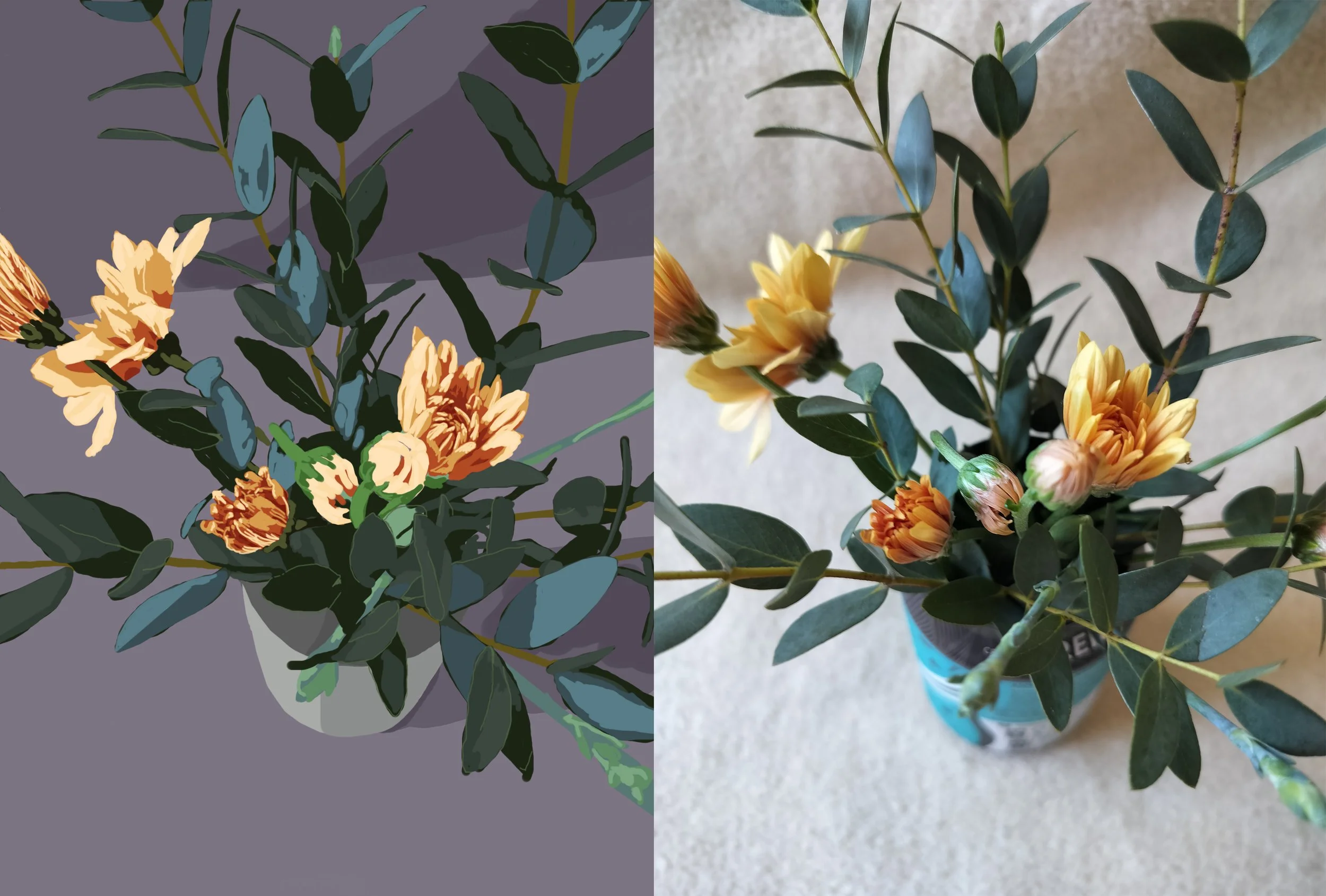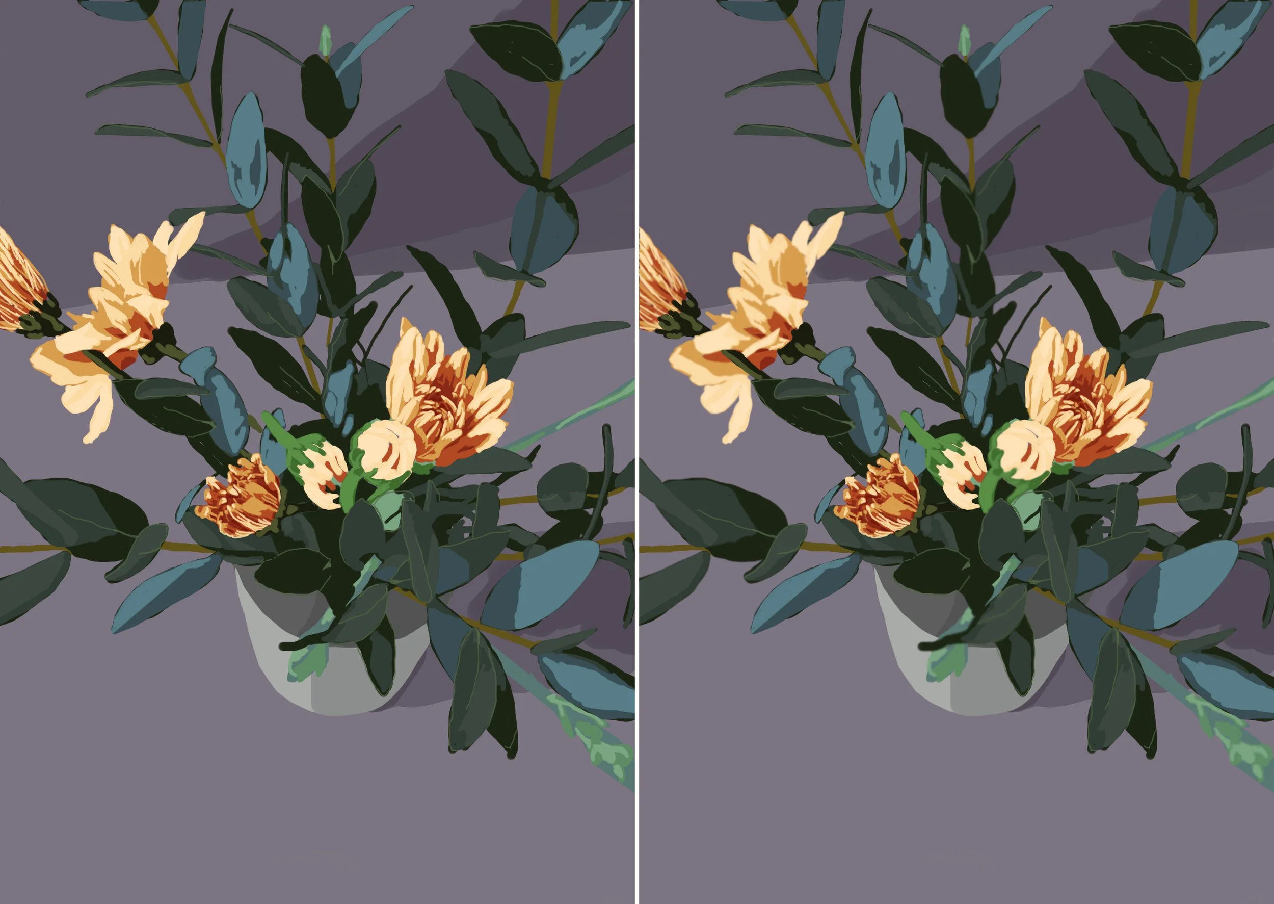 Then I edited it a bit afterwards, blurring some of the leaves and flowers like they are in the original photograph but… it didn’t make a significant difference. (The blur is in the right image, in case you can’t spot it. It’s subtle. Even I can’t really see it and I’m the one who drew it, lol.)